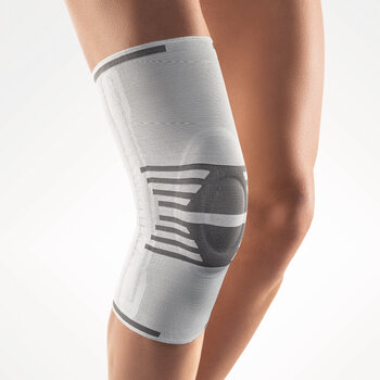 Formgestrickte Kniegelenk-Bandage zur Weichteilkompression mit Silikonpelotte zur intermittierenden Massage.